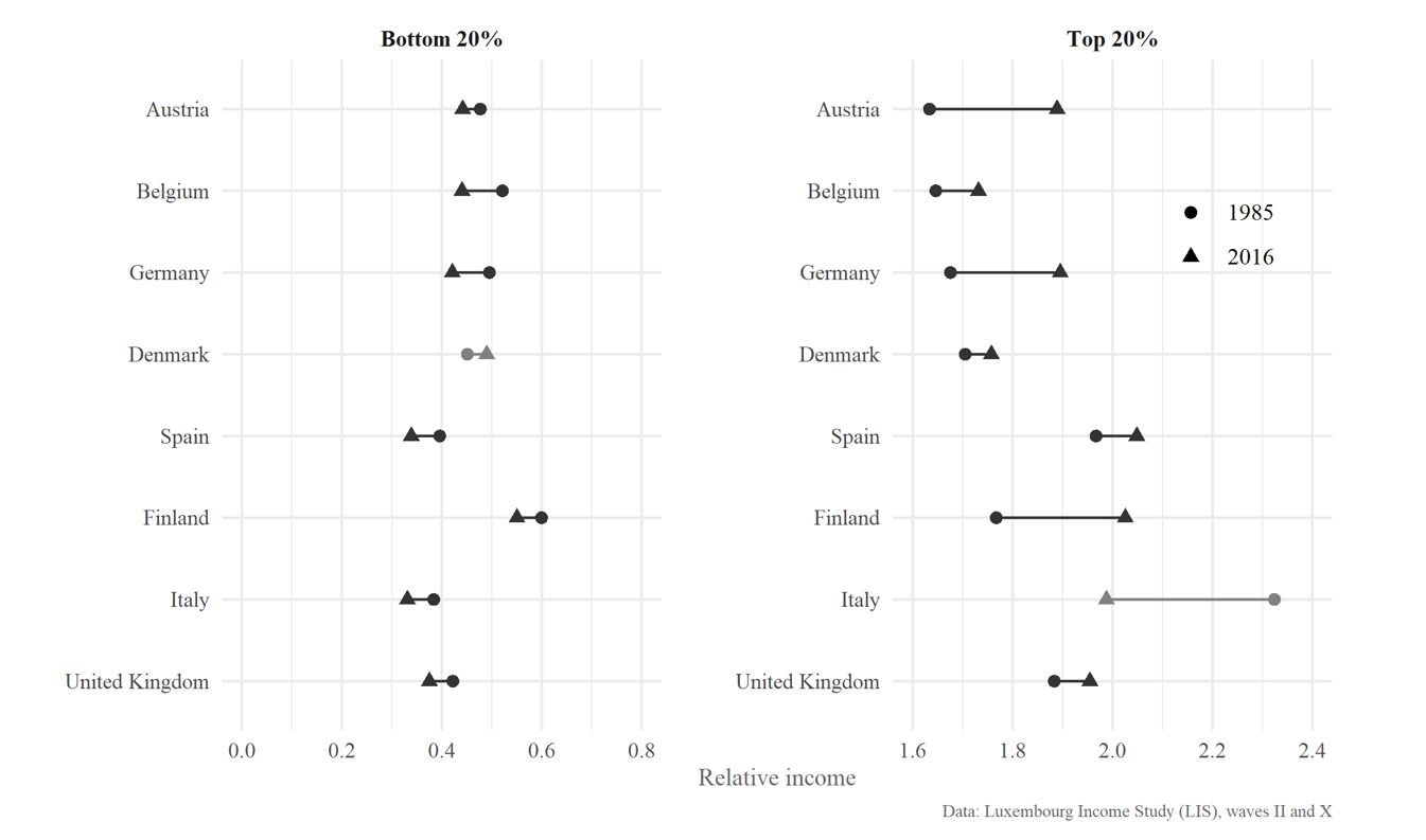 This article uses data from the Luxembourg Income Study (LIS) Database. LIS data offers standardised income and socio-economic data for a large sample of developed economies and is the income database that allows to cross-nationally compare countries further back in time. The analysis looks at eight Western European countries which cover the four welfare state regimes: Nordic (Denmark and Finland), Continental (Austria, Germany and Belgium), Anglo-Saxon (United Kingdom) and Southern (Spain and Italy). Data comes from waves II (around 1985) and wave X (2016).