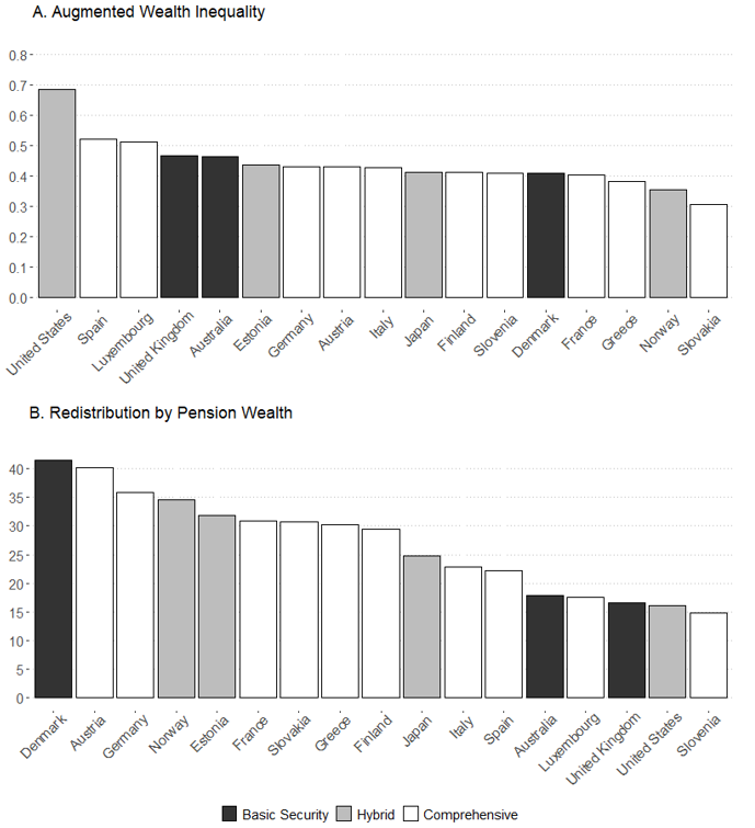 Figure 1. Augmented Wealth Inequality (A) and Redistribution by Pension Wealth (B)