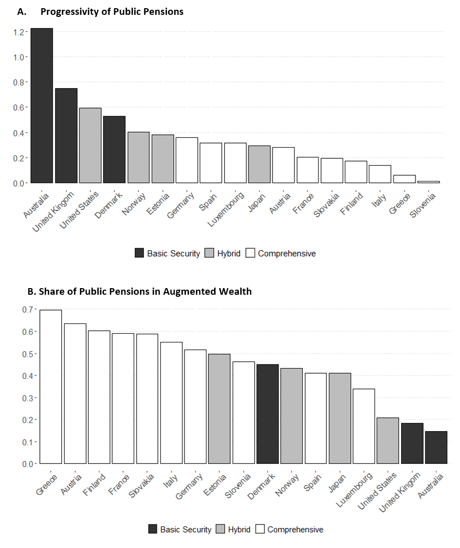 Figure 3. Progressivity Index (A) and Share (B) of Public Pension Wealth